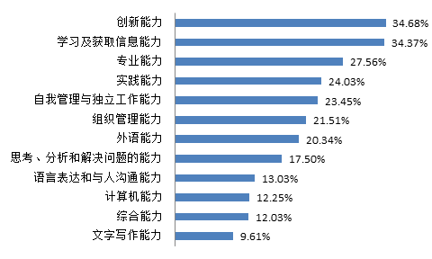 调查结果显示,2016届毕业生认为母校能力培养与实际工作需要存在差距较大的,排在前三位的是“创新能力”占比为34.68%,“学习及获取信息能力”占比为34.37%,“专业能力”占比为27.56%,具体如下图所示: