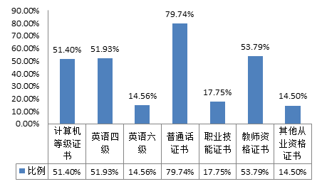 对2016届毕业生获得证书情况进行调查,结果显示,获得普通话证书占比最高,达到 79.74%;其次是教师资格证书占比53.79%,具体如下图所示: