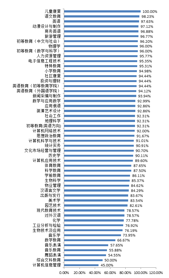 按照教育部规定的就业率计算公式,我校2016届毕业生的总体就业率为88.85%。其中本科生就业率为89.57%,专科生就业率为88.11%;师范类毕业生就业率为88.56%,非师范毕业生就业率为89.45%;男性毕业生就业率为82.15%,女性毕业生就业率为90.47%。从数据可见,我校毕业生基本上实现了充分就业。