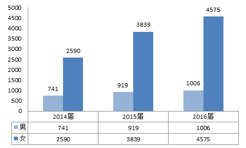 从这三年的数据中可以看出,我校的本科生人数在逐年上升,且增长幅度近一倍;专科生人数,2015年较2014年小幅度增长,2016年较2015年小幅度减少,总体来看专科生人数相对稳定。